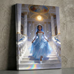 Inspired by timeless tales of magic and royalty, this enchanting portrait captures the ultimate princess moment—a grand entrance bathed in sparkle and grace. Your child’s real, smiling face is the unmistakable heart of the scene: joyful, elegant, and radiating the confidence of true royalty. Dressed in a dazzling, crowned with a tiara, and stepping in "glass" slippers, she is the undisputed star of her own storybook adventure.