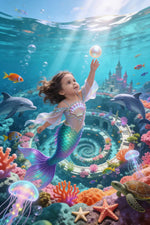 Sunlight pierces the crystal-clear water as your child — transformed into a mermaid princess with an iridescent tail of teal and purple scales — swims upward through a spiraling coral reef city, reaching for a glowing pearl. Friendly dolphins, colorful tropical fish, and bioluminescent jellyfish fill the waters around them.